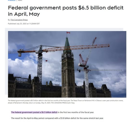 The Liberal government posted a $6.5 billion deficit in April and May.